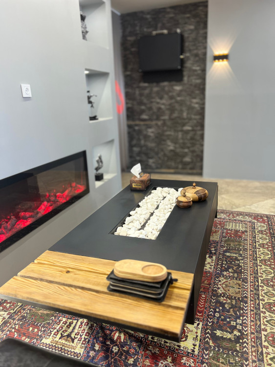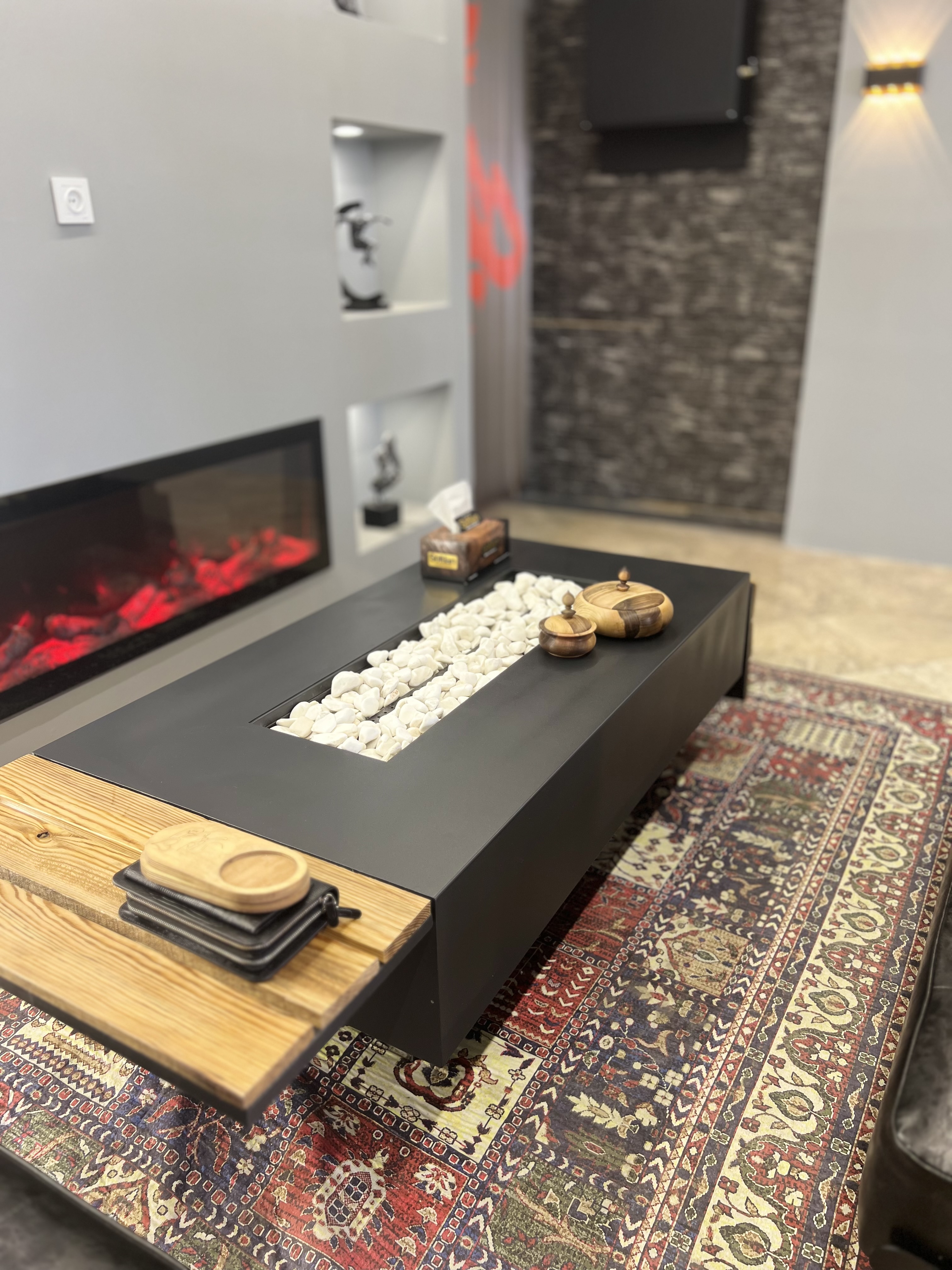 آتش دان گازی مستطیل ابعاد ۷۰*۱۲۰ دارای دو عدد میز بغل تاشو ۳۰ سانتی جمع کل ۱۸۰ سانتی متر